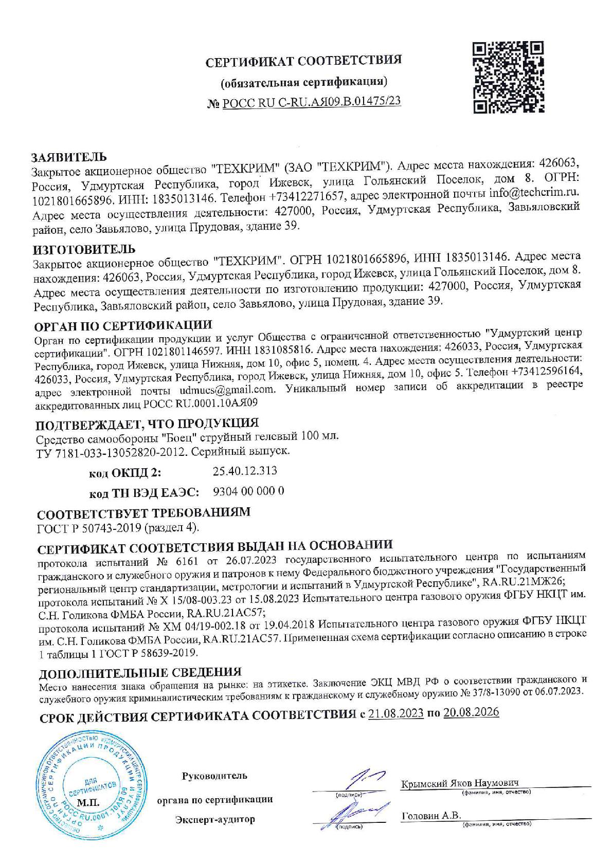 Слезоточивые вещества (ирританты): масса вещества C (суммарное содержание капсаициноидов) 650 мг (концентрация 1,0 %)