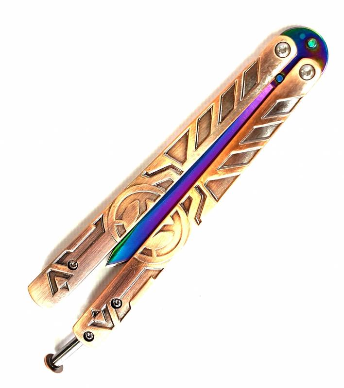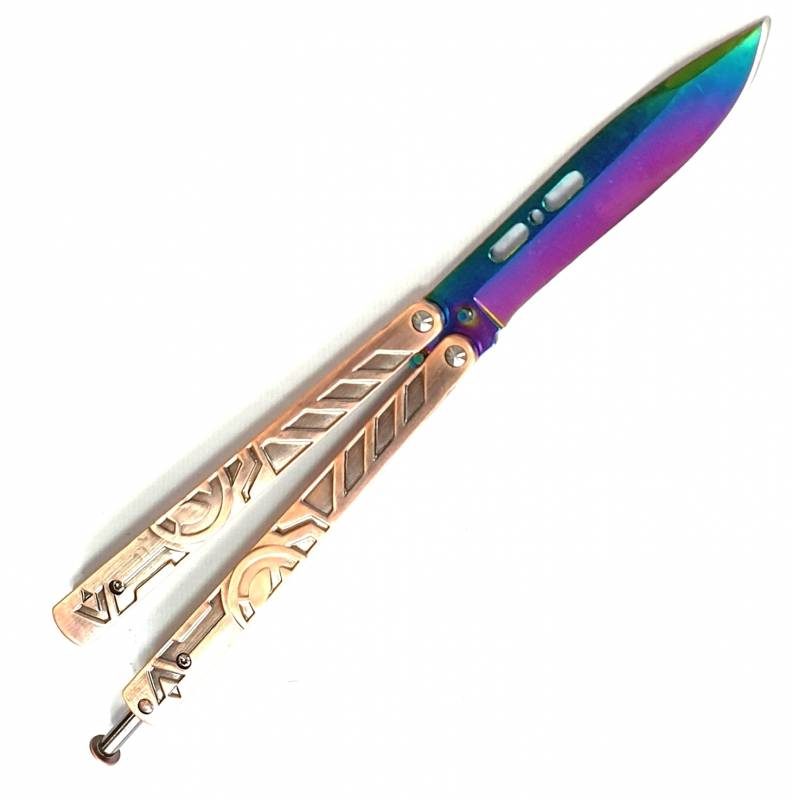 Нож складной карманный типа Бабочка. Нож поставляется в комплекте с чехлом из нетканого материала и в подарочной упаковке. Рукояти ножа с фиксацией на застежку. Длина лезвия ножа около 100 мм.