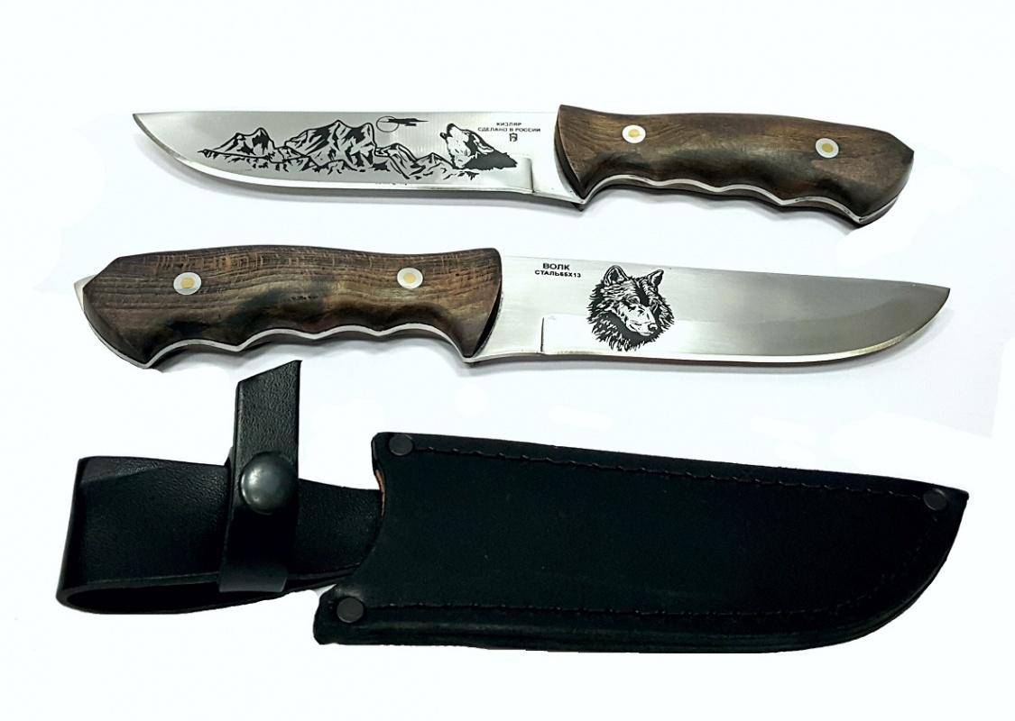 Нож туристический Волк с деревянной рукоятью, нож в комплекте с ножнами. Длина лезвия ножа 145 мм. На рукояти ножа предусмотрено отверстие для крепления шнурка на запястье. Ножны изготовлены из натуральной кожи, в конструкции ножен присутствует петля для ношения ножа на поясном ремне. Нож изготовлен из стали 65х13, в республике Дагестан, город Кизляр. Во избежание получения травм, при передвижении и транспортировке нож рекомендуется хранить в ножнах. Нож не предназначен для метания, нанесения рубящих ударов и длительного воздействия влаги. Ножны рекомендуется сушить при комнатной температуре. Не рекомендуется подвергать нож сильному нагреву и воздействую открытого пламени.