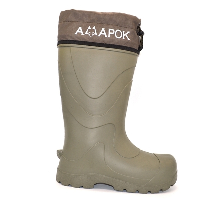 Сапоги ЭВА "АМАРОК" изготовлены из сверхлегкого морозостойкого материала вспененного этилвинилацетата (ЭВА), с высоким содержанием вспененного каучука. Материал ЭВА обладает такими преимуществами, как не истирается, не пропускает влагу и гарантирует длительный срок эксплуатации. Сапоги изготовлены методом бесшовного литья, сапоги обладают рядом преимуществ, таких как - легкость, эластичность, водонепроницаемость, морозостойкость, в данной модели сапога применена перфорированная стелька для сбора конденсата, а так же водонепроницаемая манжета со светоотражающим логотипом, дополнительно являющимся элементом пассивной безопасности в тёмное время суток, и в помещениях со слабым освещением. Расчётная рабочая температура сапога до -40С. Сапоги комплектуются многослойным вкладышем - утеплителем, рассчитанным на активную эксплуатацию до -45С.