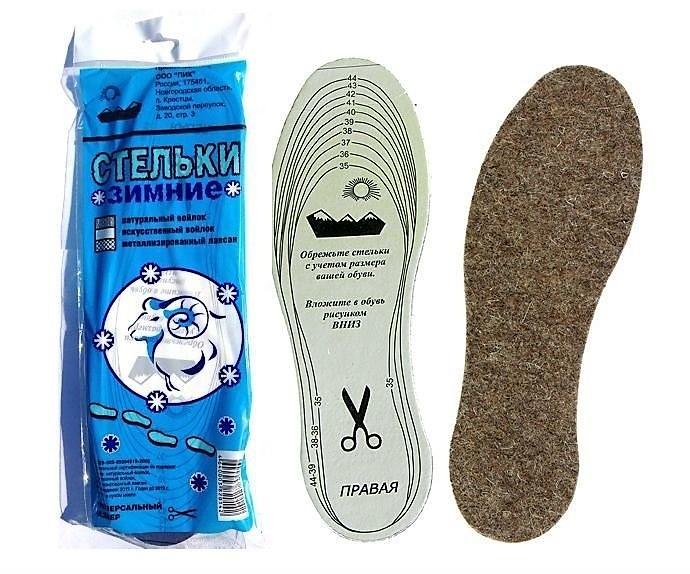 Стельки зимние войлочные фольгированные в индивидуальной упаковке. Стельки универсального размера от 35 до 45 размера, размер вырезается по шаблону нанесённому на стельку.